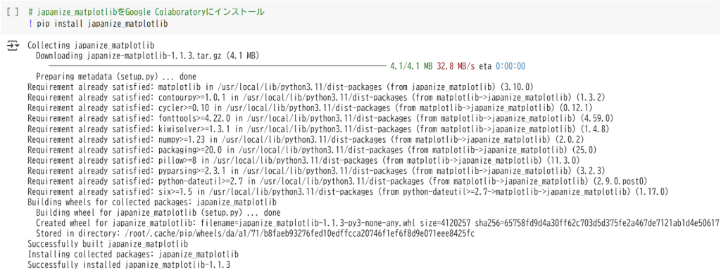 ! pip install japanize_matplotlibを実行すると、以下のような実行結果が表示される。