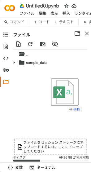 インポートが終わりランタイムに接続している状態で、ファイルをアップロードしよう。