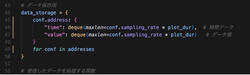 次に、data_storageで、maxlen = サンプリング周波数 x 表示時間 秒 に変更します。