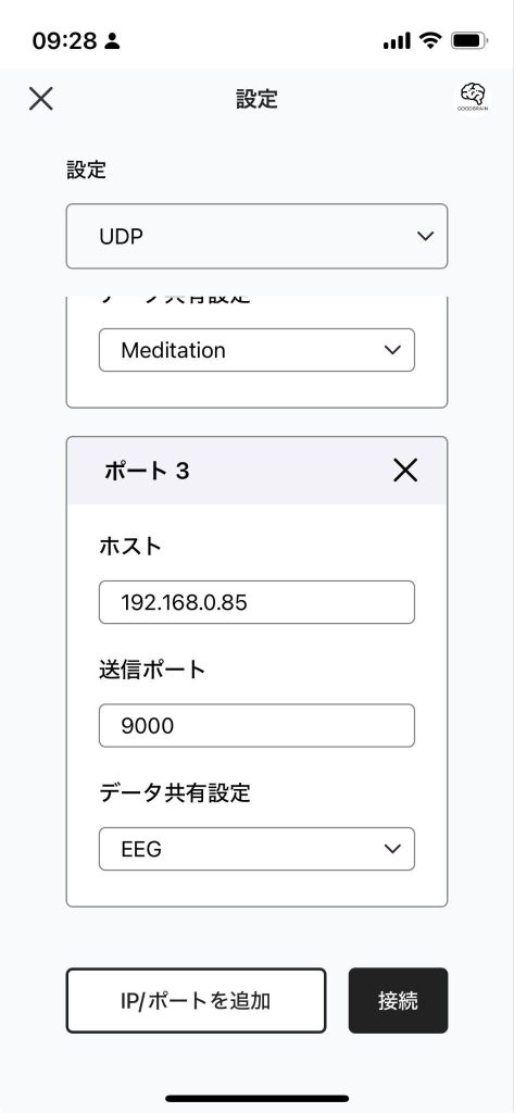 ここでは、/EEGを取得してみましょう。GB Focus でポートを追加し、以下の写真の「ポート3」のとおりに設定してください。
