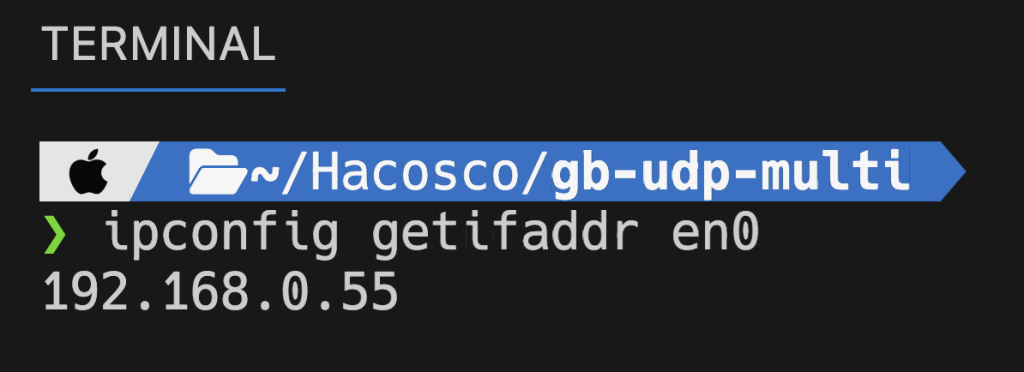 スマートフォンのGB FocusアプリとPythonプログラムでUDP通信をするのに、IPアドレスが必要です。Macでは、ターミナルで下記コマンドを入力すると取得することができます。