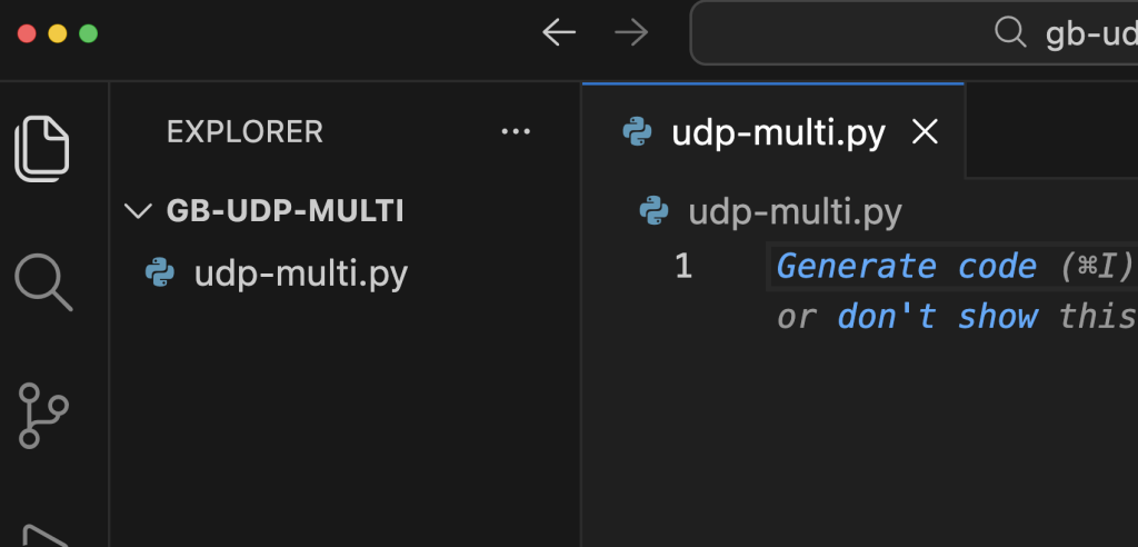 まずは、好きな場所にフォルダを作成し、それをVS Code で開きます。そして、udp-multi.pyというファイルを作成します。